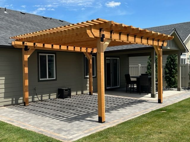 - Wood Pergolas: Classic and timeless, our wood pergolas add a natural, rustic charm to your outdoor space. We use #1 Kiln Dried Douglas Fir Timbers, Redwood, and Cedar to ensure longevity and durability.